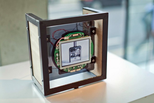 A small video monitor is mounted inside a metal frame, displaying a video loop of a rubber stamp repeatedly stamping a document. Each time the video of the rubber stamp thumps against paper, the monitor screen physically moves with a jerk.
